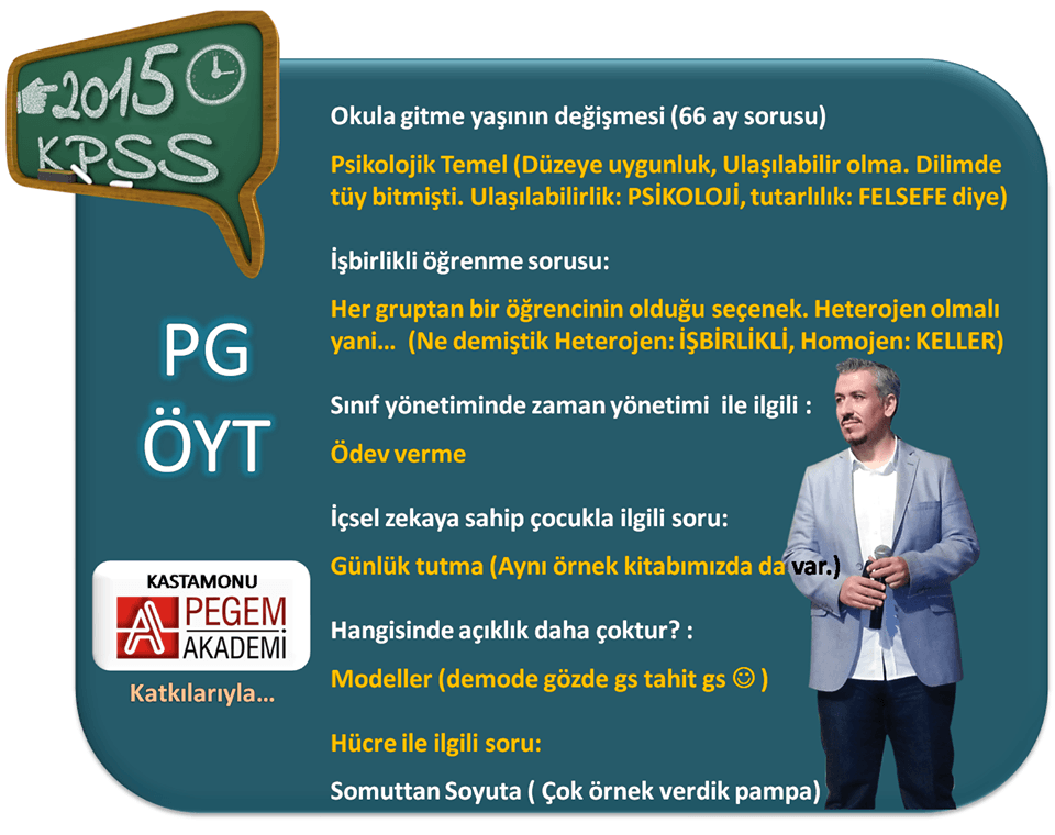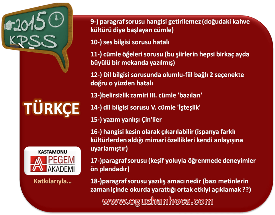 2015 KPSS Türkçe, matematik, tarih, coğrafya, anayasa (vatandaşlık), güncel bilgiler ve eğitim bilimleri (öğretim yöntem ve teknikleri, gelişim psikolojisi, öğrenme psikolojisi, ölçme ve değerlendirme, rehberlik) konularında, derslerinde çıkan soruların cevapları gayet açık bir şekilde görsel olarak aşağıda sizlere sunulmuştur.